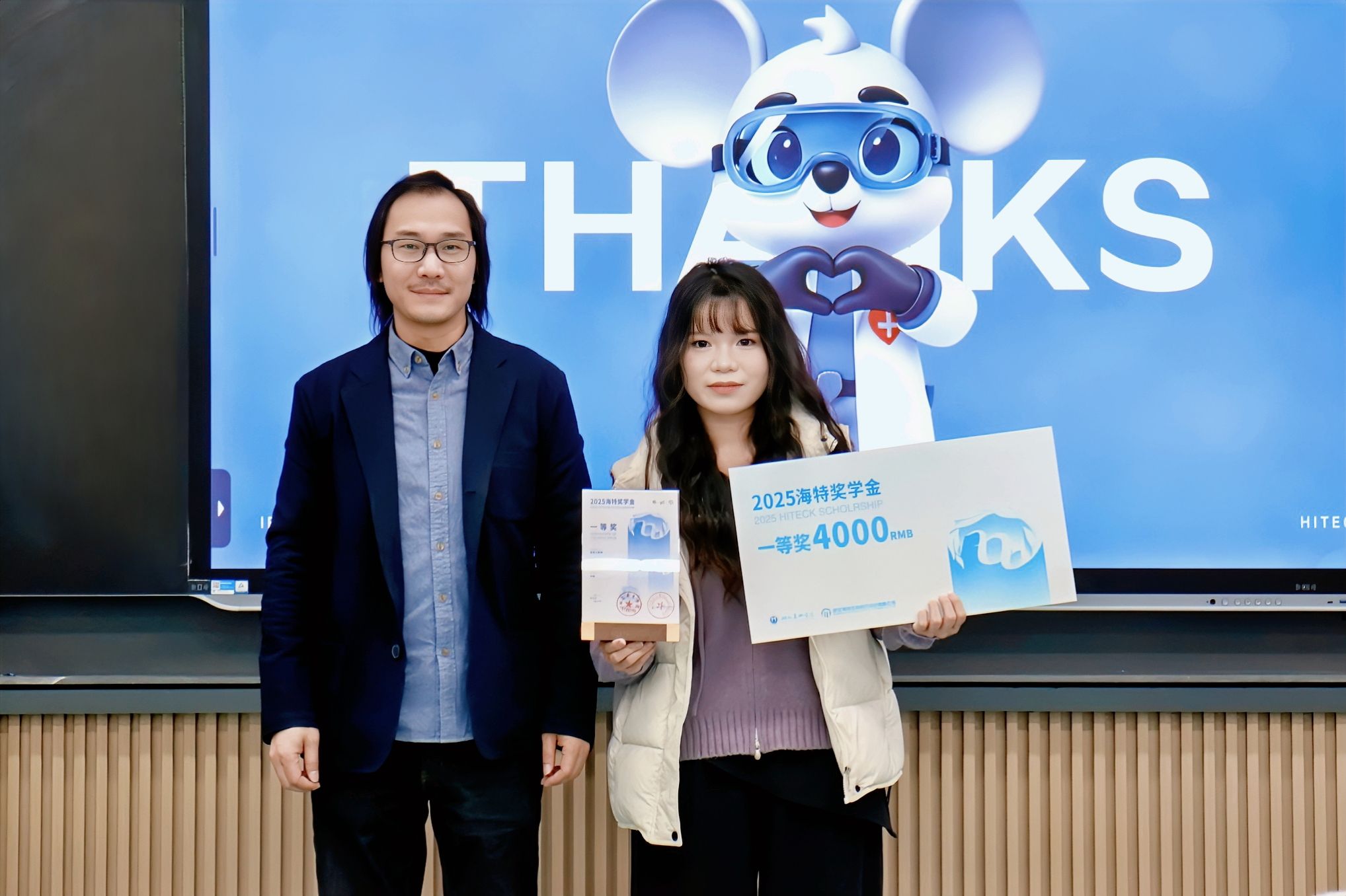 视觉艺术学院副院长朱志平为“海特奖学金”一等奖获奖同学颁奖