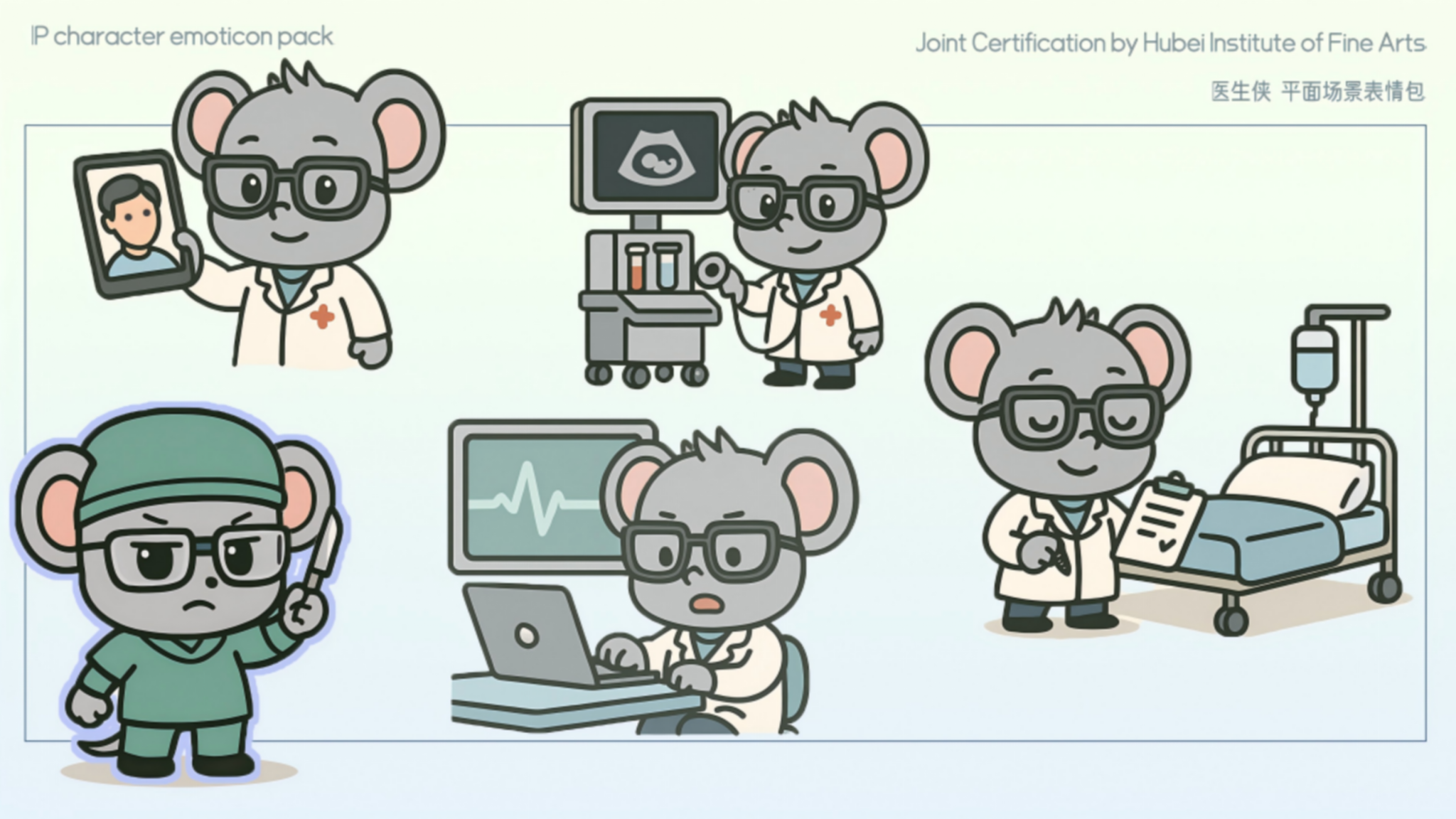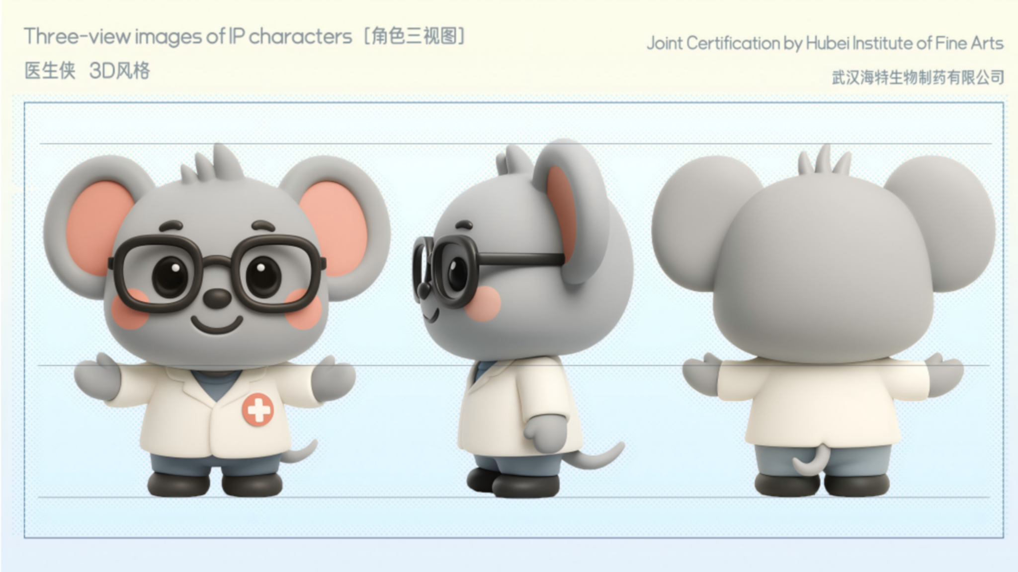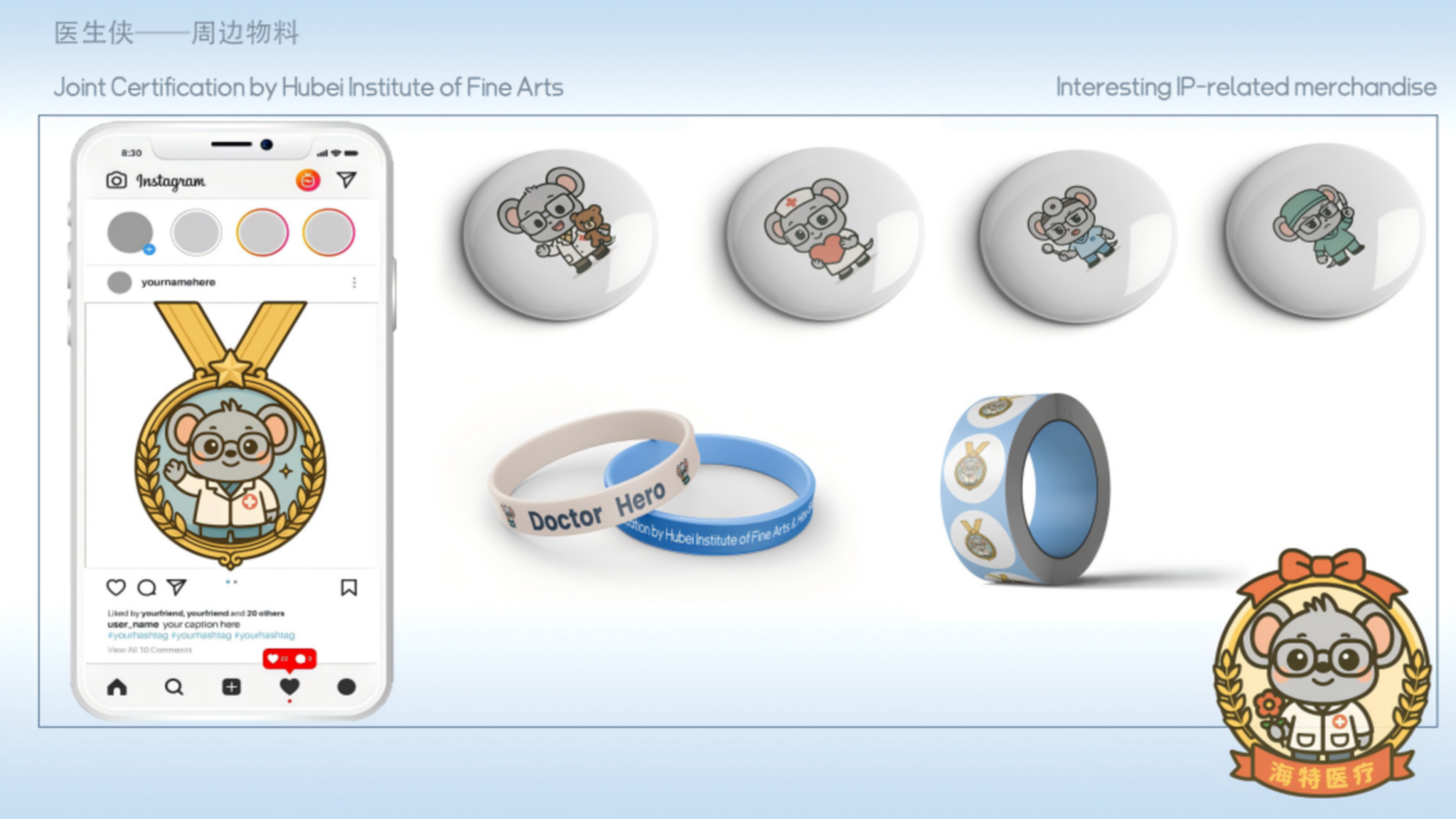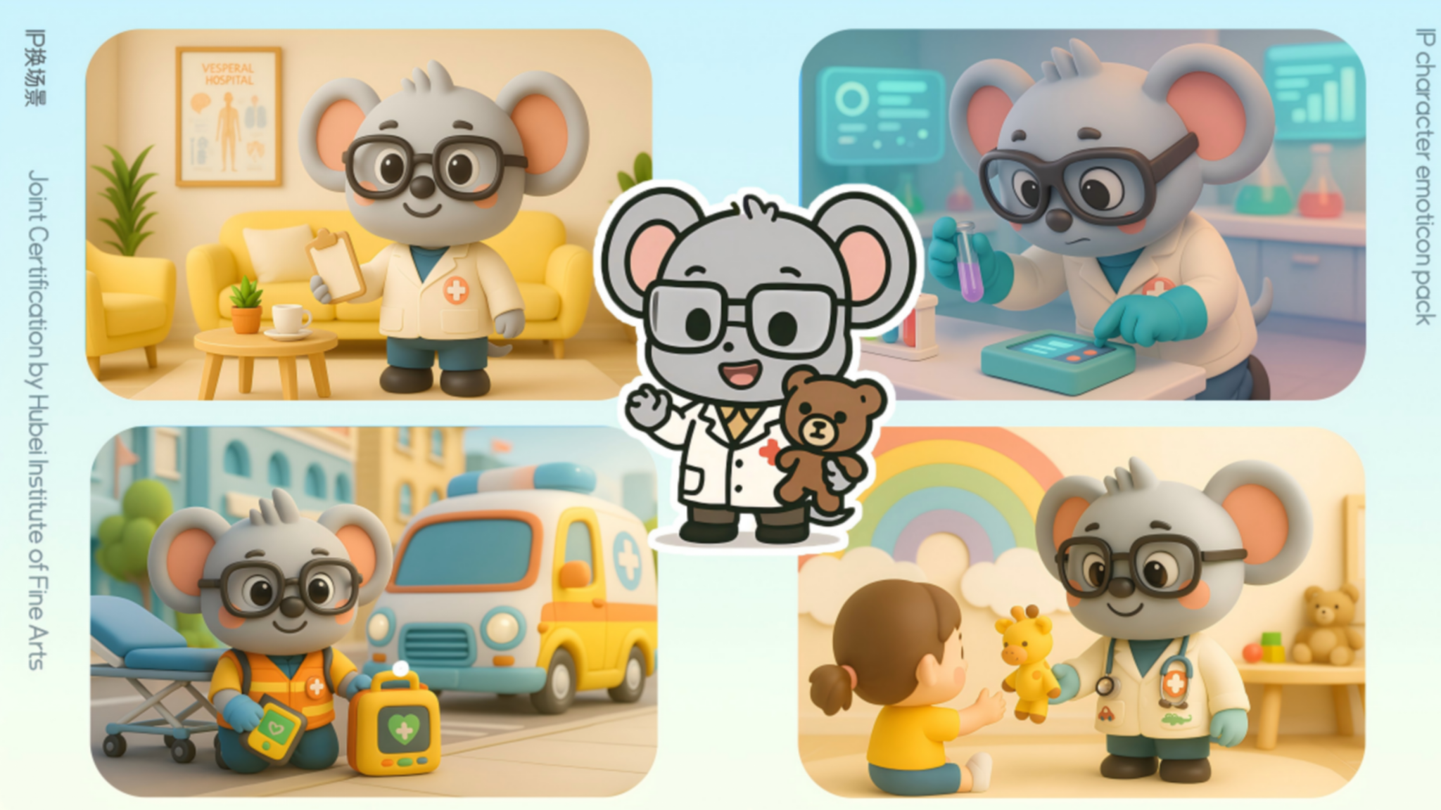 作品说明:本作品根据原本的IP形象进行二次创作,将医生侠可爱软萌化,更贴合现在的审美,并且以此为创作进行了2D转3D,制作了表情包,并且将医生侠进行职业转换,对场景进行塑造形成场景图。结合现代盲盒进行创作,将不同职业,不同姿态的医生侠放入。在场景应用方面,结合了年轻人最为喜欢的吧唧,明信片进行结合。